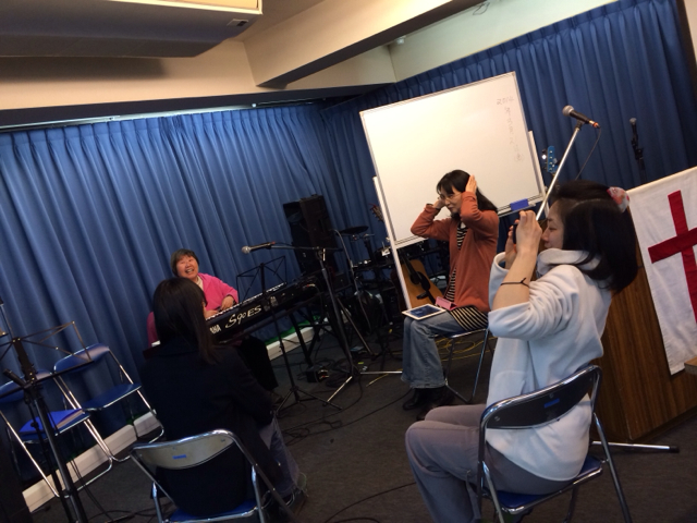 会堂では、Gifts祈祷会のあと、 エウカリの方々が辻郷牧師からボイストレーニングを受けています。 萱野