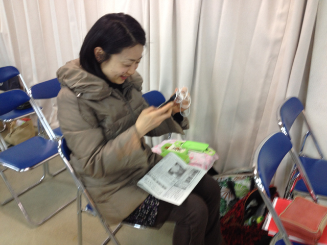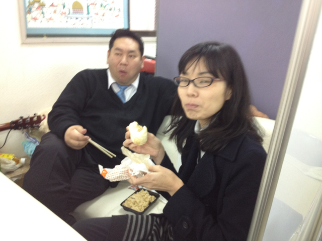 シオンちゃんは海苔巻き。 真境名牧師とシオン園子さんもランチ中。セブンイレブンで肉まんが安かったですよ~。