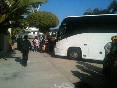 ロサンゼルス到着。空港には大型バスが迎えに来てくれています!