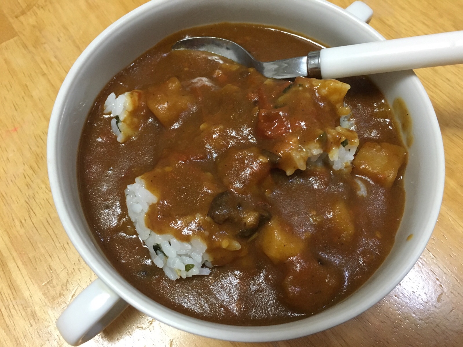遅いお昼です。 レトルトカレーにトマトを入れてトマトカレーに変化させました! Kayano
