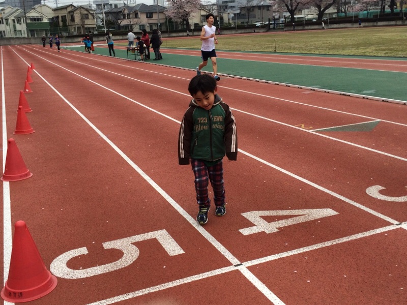 2.5キロ走の人たちに混じって、ヨッシーはトラックを2周しました。 ヨセフ