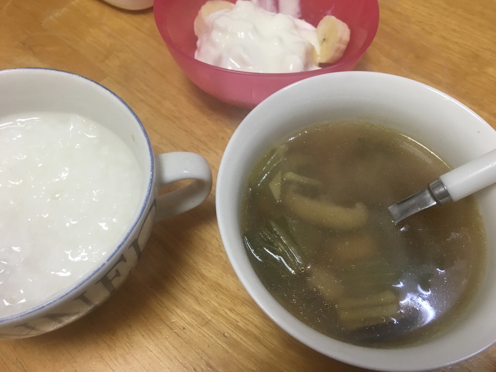 まだ今日も休んでいます。 熱は無いようです。咳が出始めていますが.. 今日のお昼はお粥と生姜スープとバナナのヨーグルトです。 Kayano
