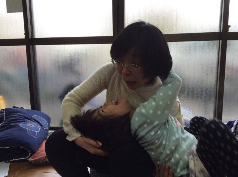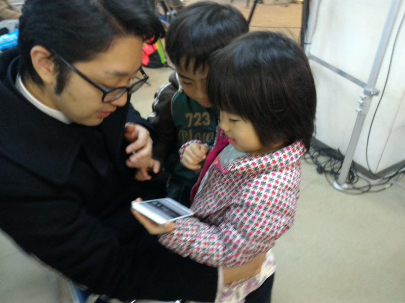 ヨハネ君のひざの上で、ヨッシー、るんちゃん楽しそうにiPhoneを見てます。 Gospel Seed ヨセフ