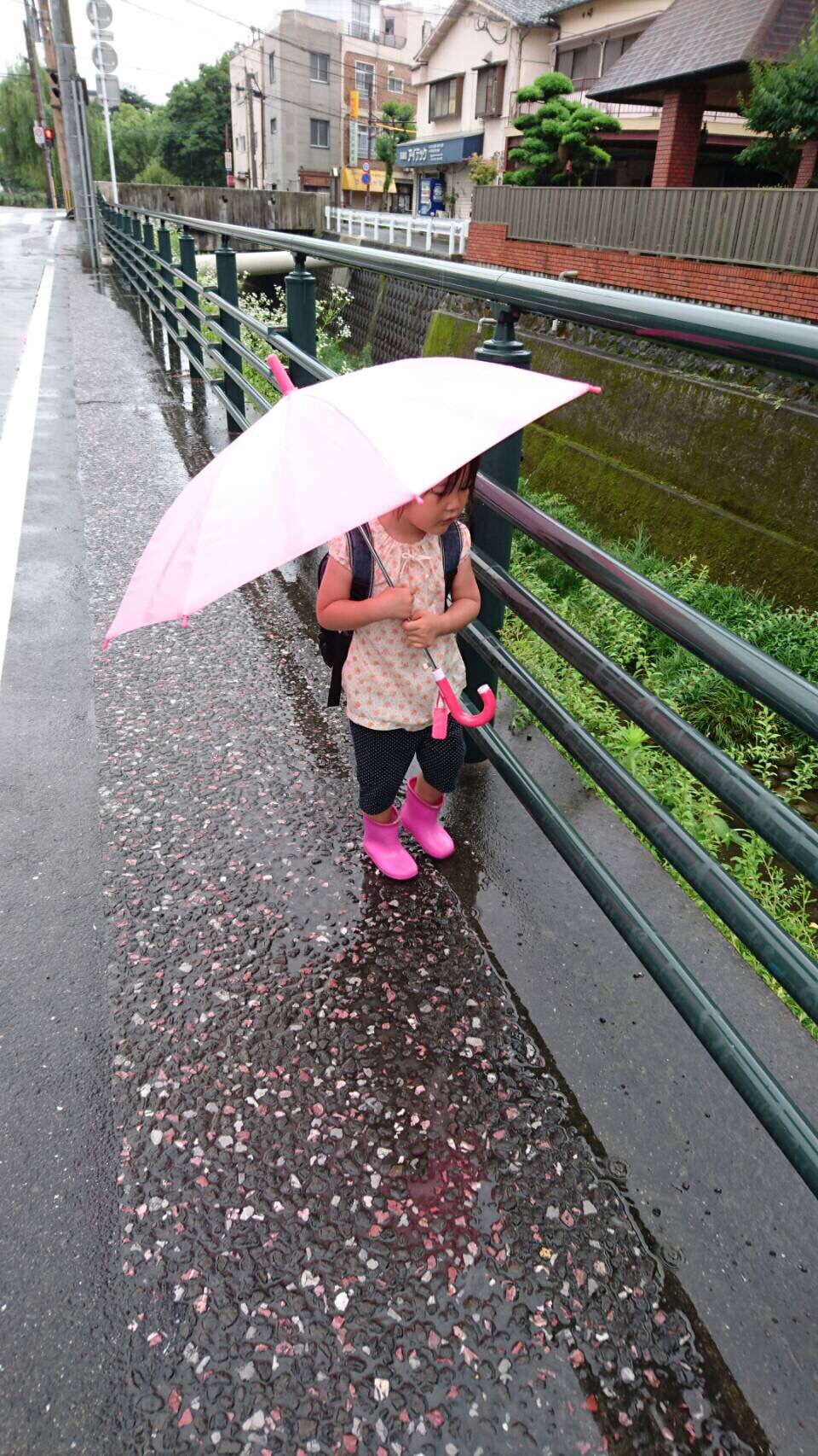雨の降る中、傘をさして保育園へ(^-^) 「今日は鳥さん、川にいないねぇ…(´・ω・`)」 長崎教会CSチーム