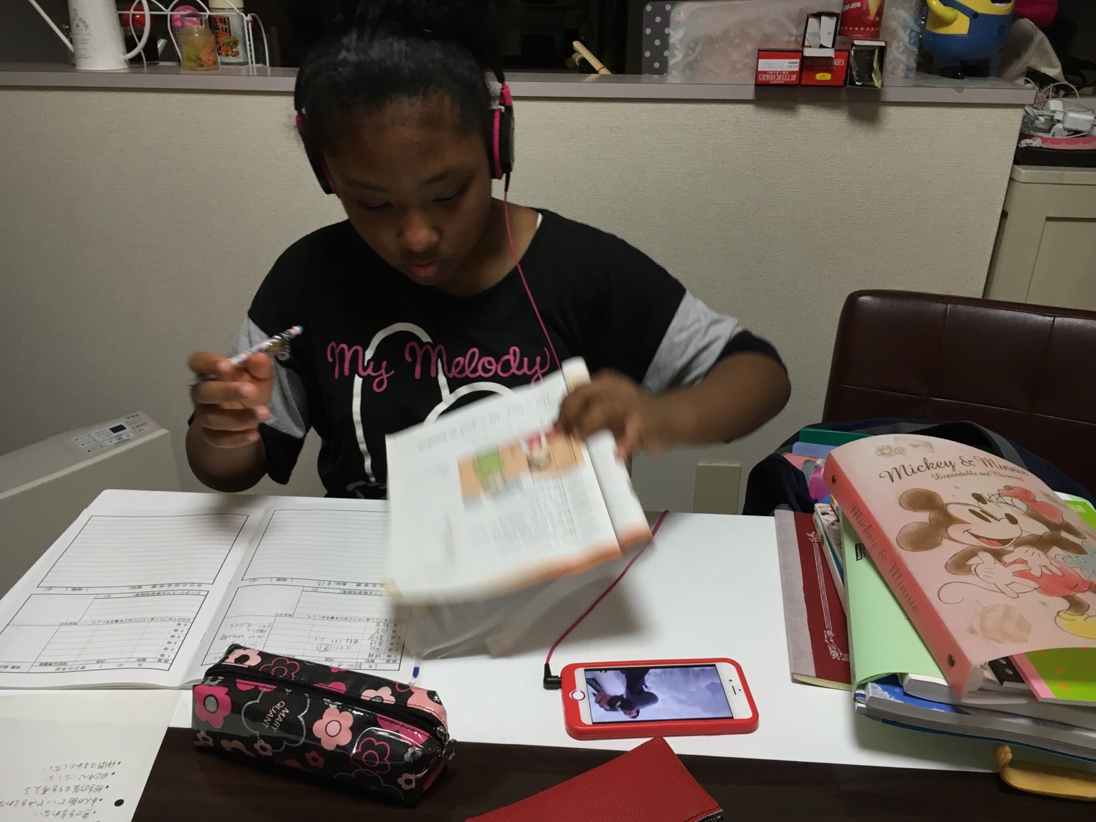 ヘッドホンで音楽聴きながら〜 宿題しています(^o^) 勉強の能率が上がるんだって? 四日市 ほめ歌