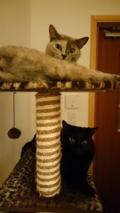 親子で仲良く、キャットタワーで。(親戚宅の、母ネコのアンビちゃんと、息子ネコのクロちゃん)