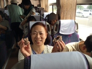 楽しい昼食は、バスの中で。 ハンナさん、赤飯をいただきました。 北九州