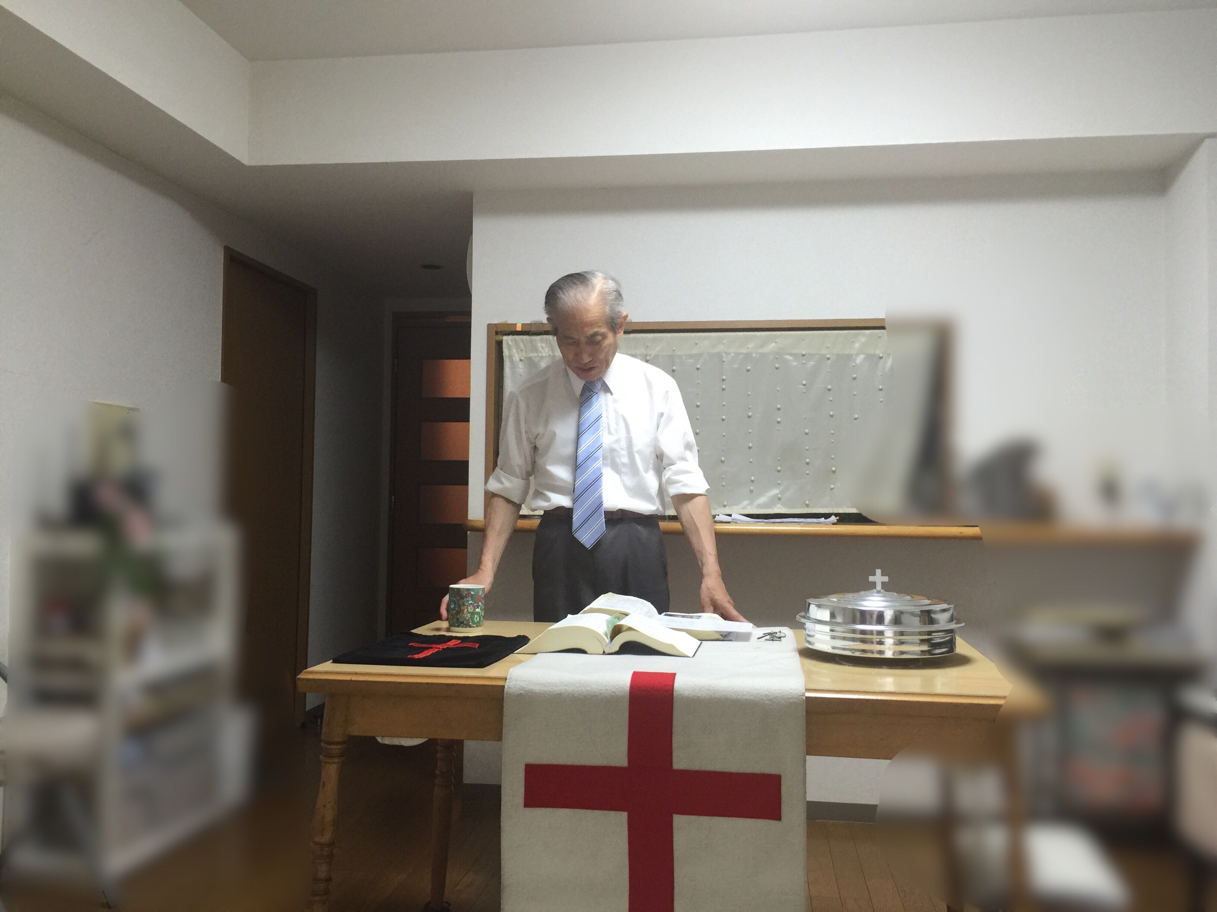 兄家族からの贈り物のネクタイをさっそく着けて、メッセージ中の父・ヨシュアさん☆ 大和教会 hannah.t