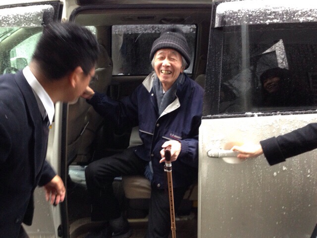 大雪の中、教会に到着された時の新井先生! お帽子が暖かそうでお似合いですね!