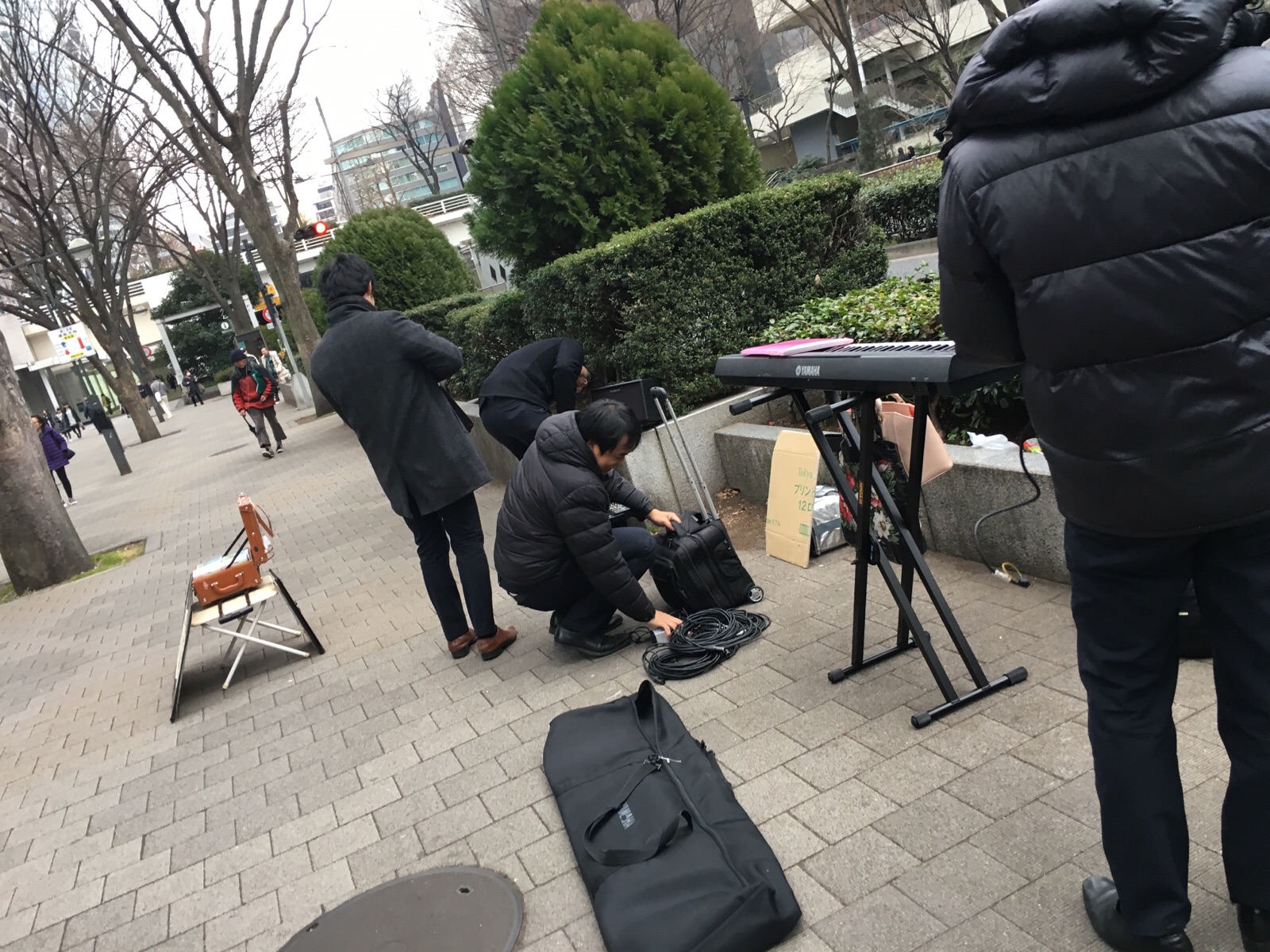 さあ、今日は西新宿のここで路上ライブです。 車から電源取ります。