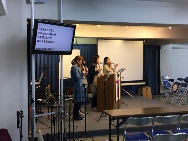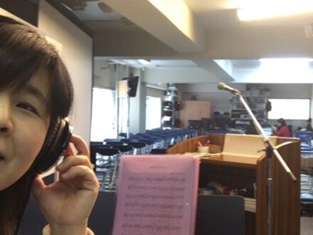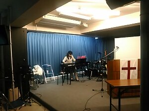 会堂に来ています。 キーボードをイヤホンでやっています。 Kayano