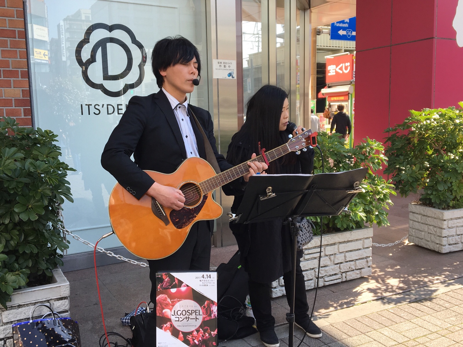 駅前では、こころごすぺるコンサート宣伝が行われています。路上ライブは、パトリスのみなさん!