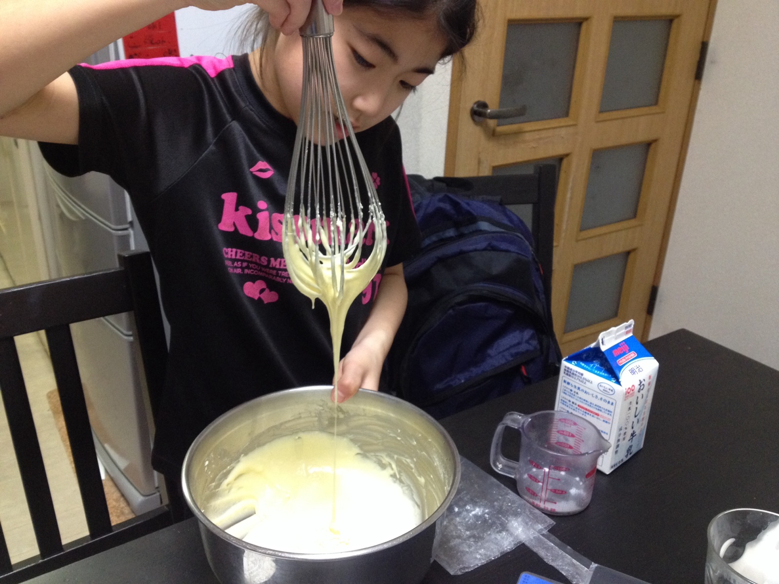 春休みの宿題で自分で作った物をみんなで食べるんだそうです。ホットケーキ作ってます。 東フィラデルフィヤ シオン