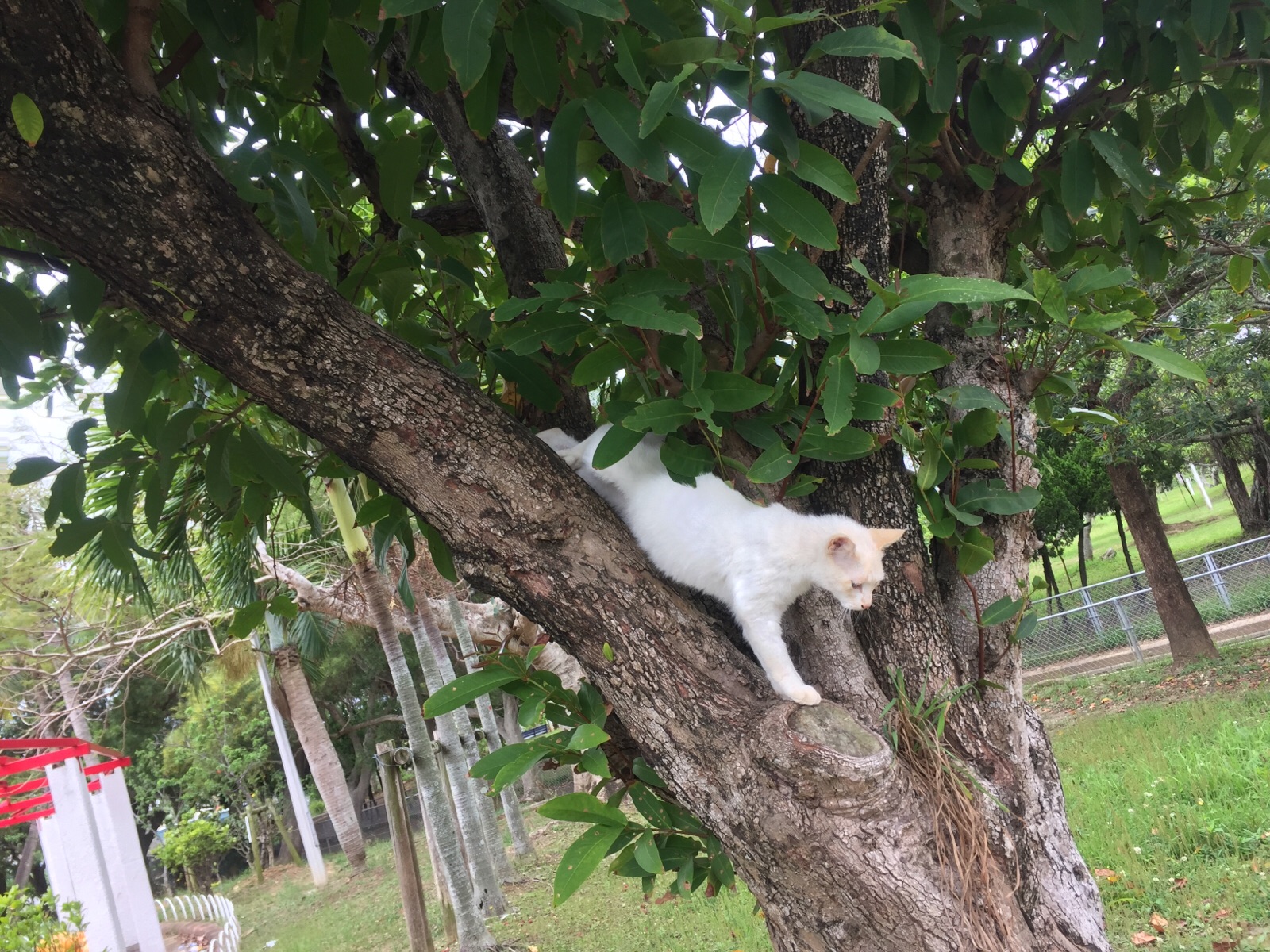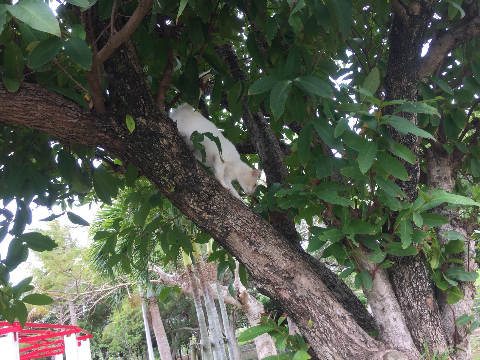 ゴールデンウィーク前の公園は静かでした。でも面白い光景に出くわしましたよ! カメラに気づくと木の上から降りてきました。お昼寝の邪魔したかしら? 沖縄エルサレム sueko