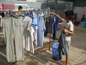今日も、いい洗濯日和の1日。大きい子も、小さい子も、男の子も、女の子も、みんな自分で洗濯します。基本は、手洗いです!(カンボジア)