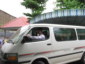 午後のクラスが終わる子ども達を迎えに行く、孤児院のバンと運転手さん。カンボジアは、道路は右側通行、車は左ハンドルです。(カンボジア)