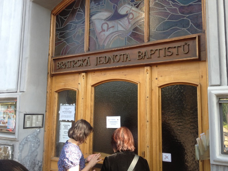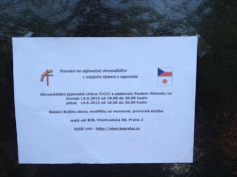 Place of the holy meeting this evening ☆ in a Baptist Church in Prague! Sign is shown about the meeting by TLCCC, too.