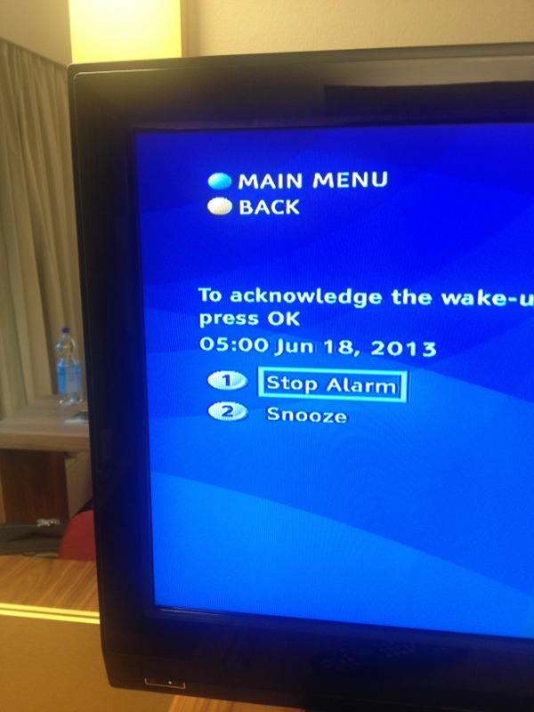 Wake up call of this hotel is not by phone but the switch of TV will on automatically, and an alarm will sound! But it is very small sound. So it is difficult to wake up with it. br />