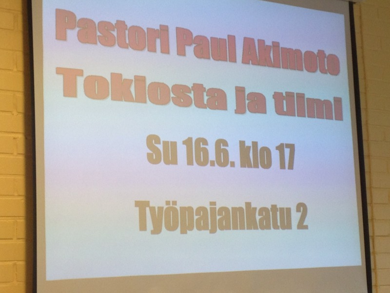In a screen, it says “Pastor Paul Akimoto and a team from Japan, Sun June 6 at 5 p.m., Conference Place:Työpajankatu 2”