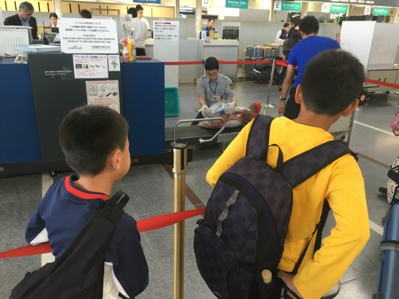 中部国際空港で荷物検査。 少年たちは興味深々。 名古屋