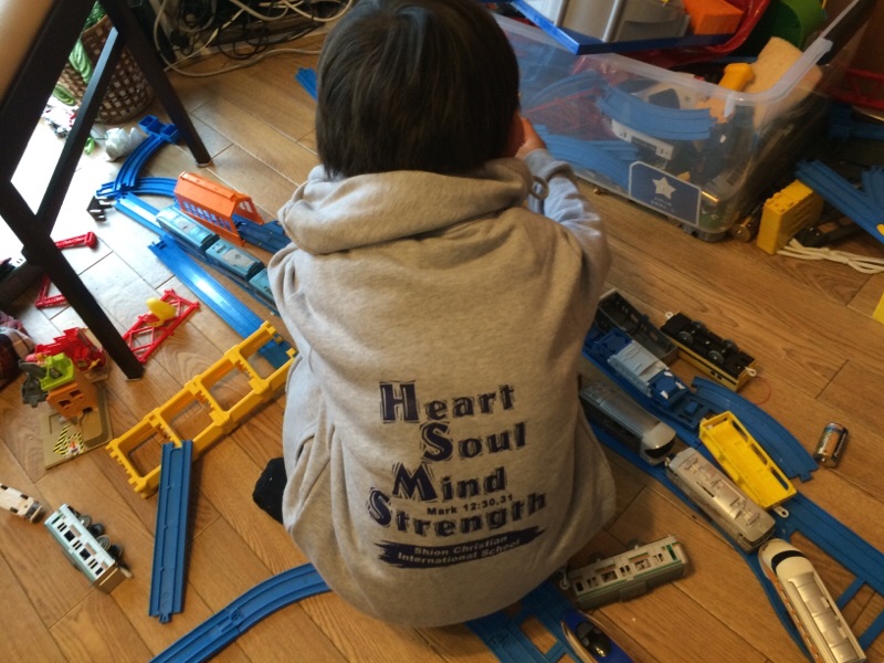 帰ってきてすぐプラレールで遊ぶ息子。 学校のパーカーは「マルコ12:30.31」の文字が! (ゴスペルシードのほんのりカフェたいむ) ハルぼん
