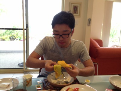 マンゴーをほおばるヨハネくん。