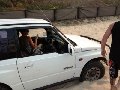 前回のチームで砂浜を歩いていたら、砂にはまって動けない車発見。