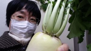 帰りに隣の畑で大根を買いました。100円を入れて取り出すロッカー式になっています。葉っぱの部分もとっても新鮮です。