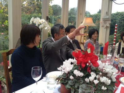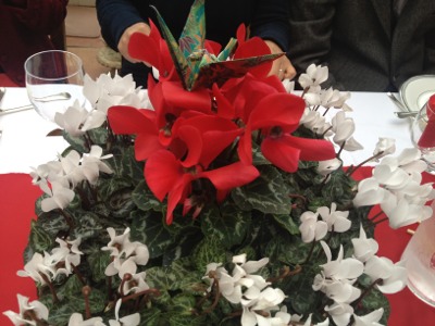 いろんな国の旗があるけど、日本のはなかったので、花でアレンジして下さっていました。上には、折り鶴が!