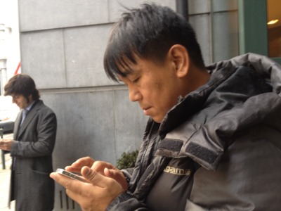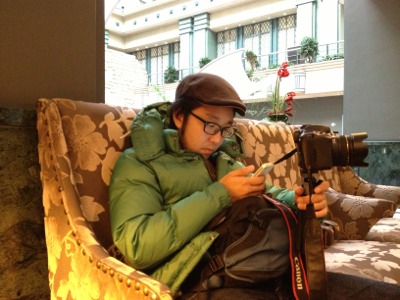 今日の撮影に備えるヨハネ兄。 iPhoneで下調べ。