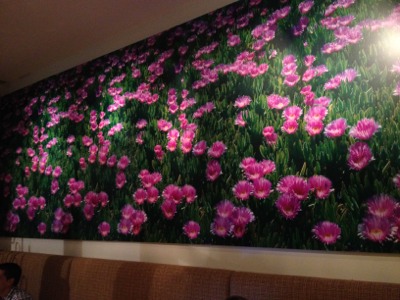 The photo of flowers is displayed on the back of the wall. Is this restaurant’s image a fresh green field?