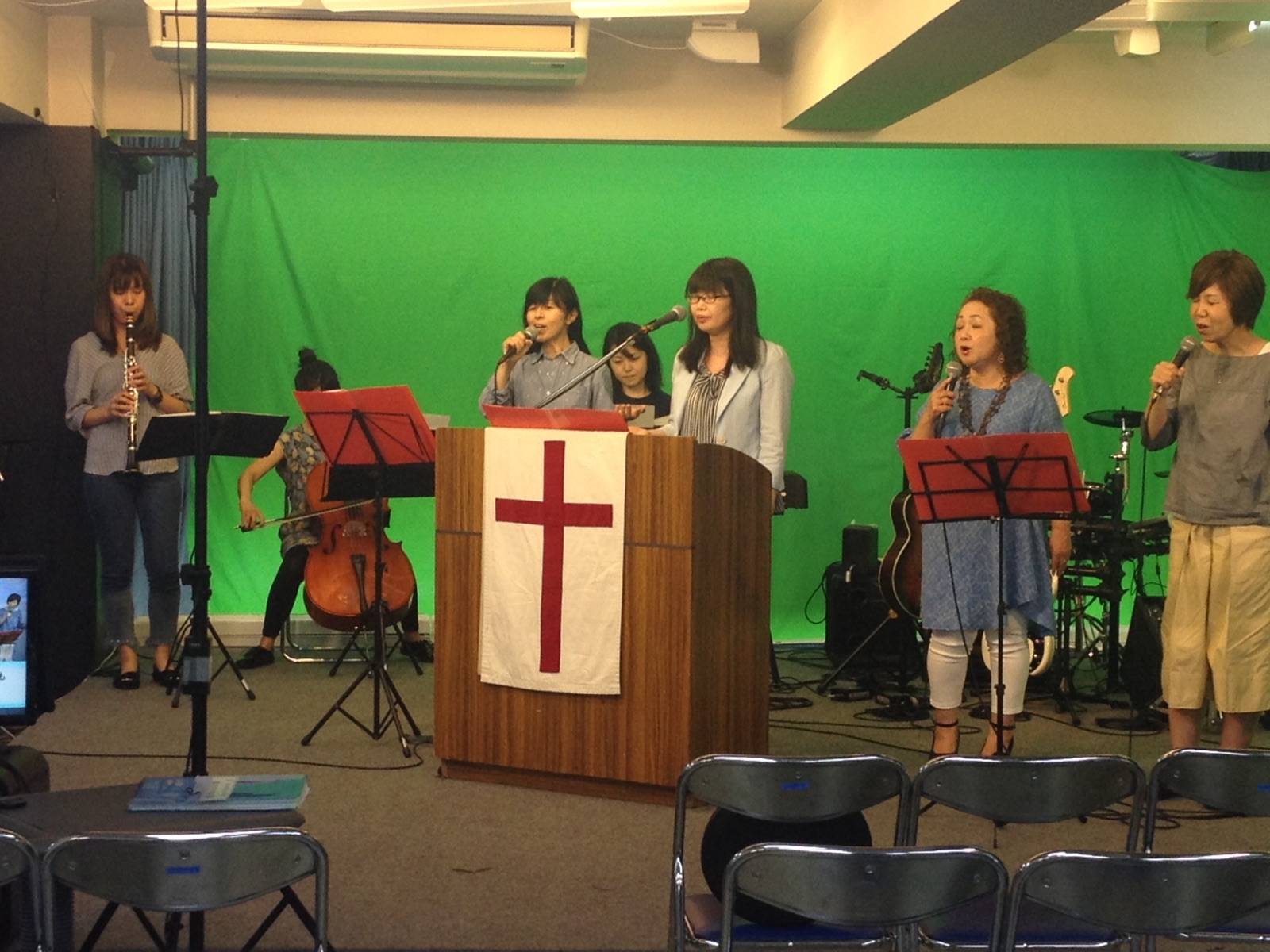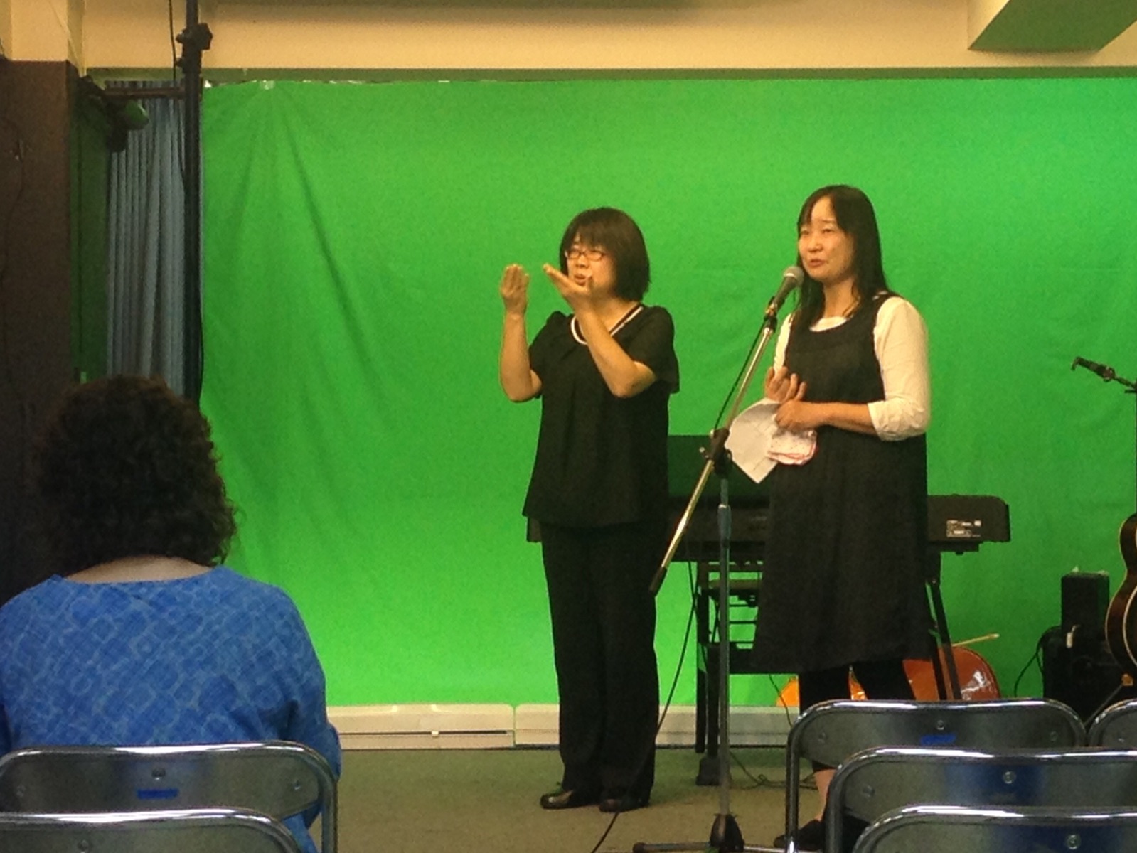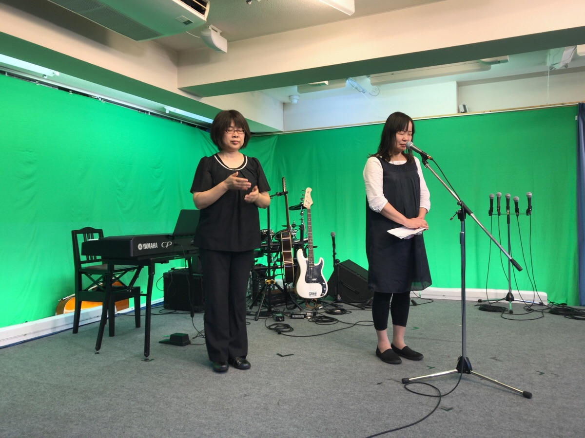 ナオミさんがリードして共に賛美! いつも配信を見て参加してくださっている方が今日は会堂に来られています。
