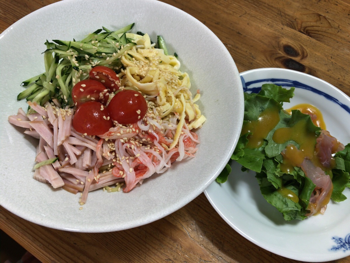 娘もオーケストラの祈祷会が終わって部屋から出てきました。これから夕ごはんをいただきます。冷やし中華とサラダです。 オギハラ