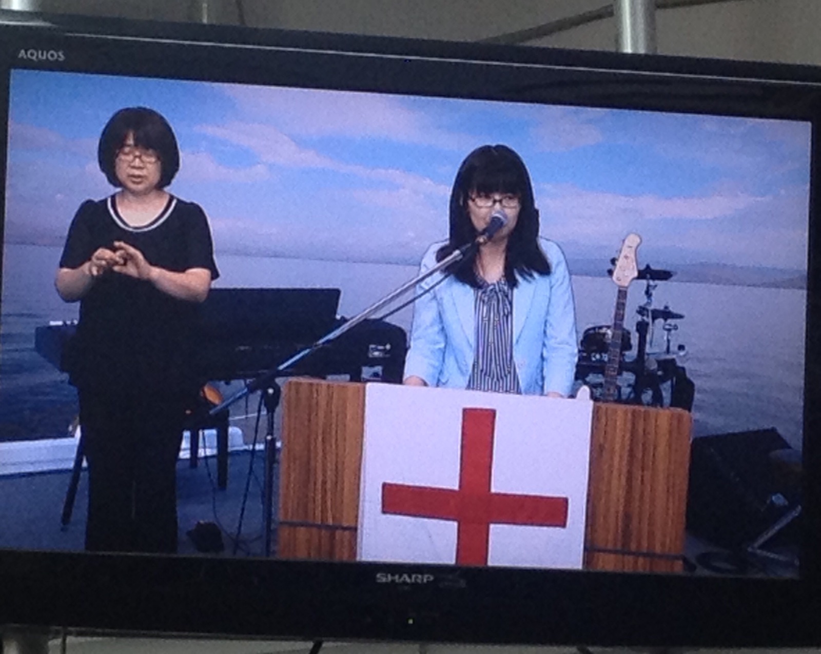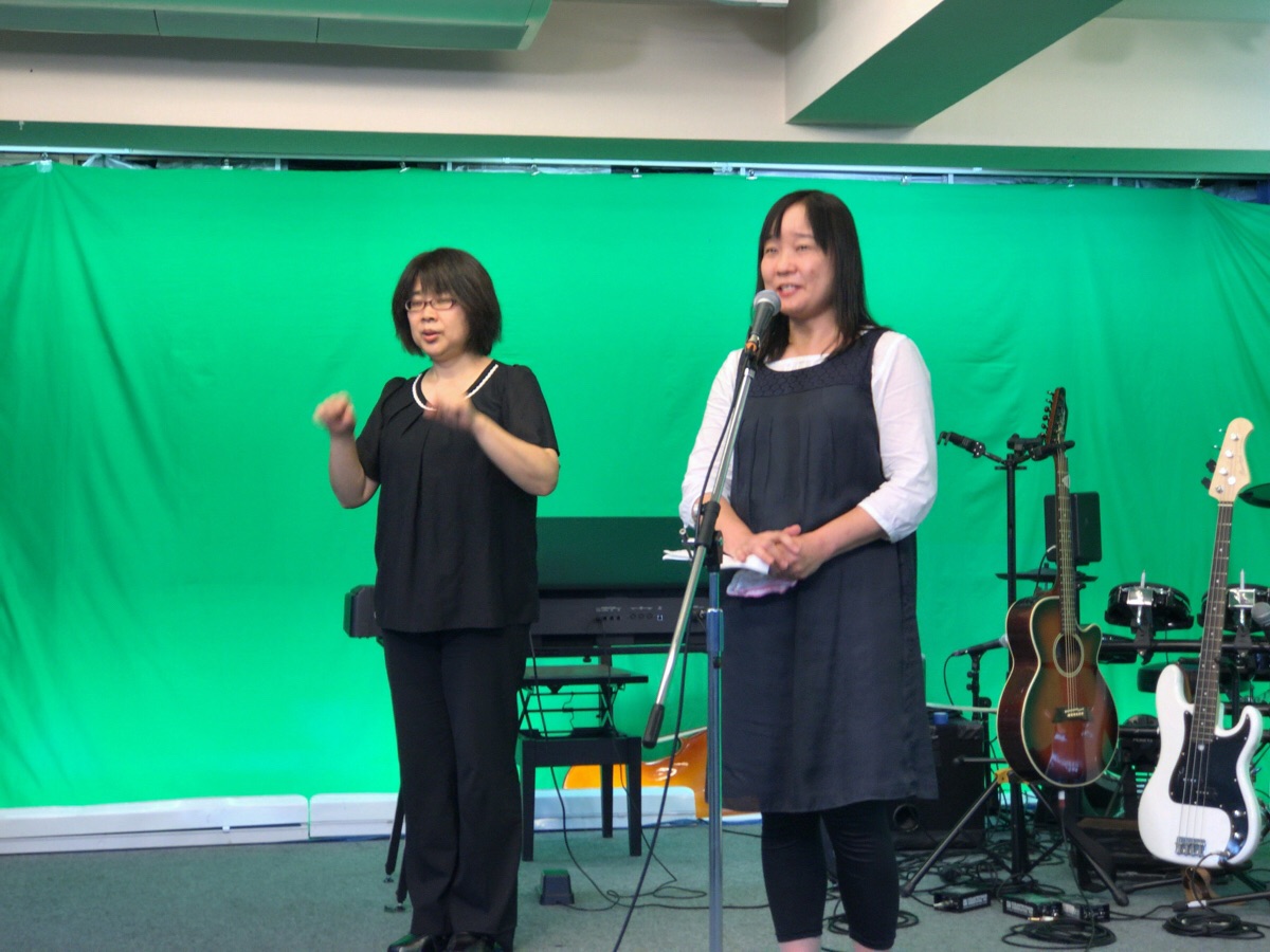いやしの体験談を清水さんが語っています。 星野さんが手話通訳しています。