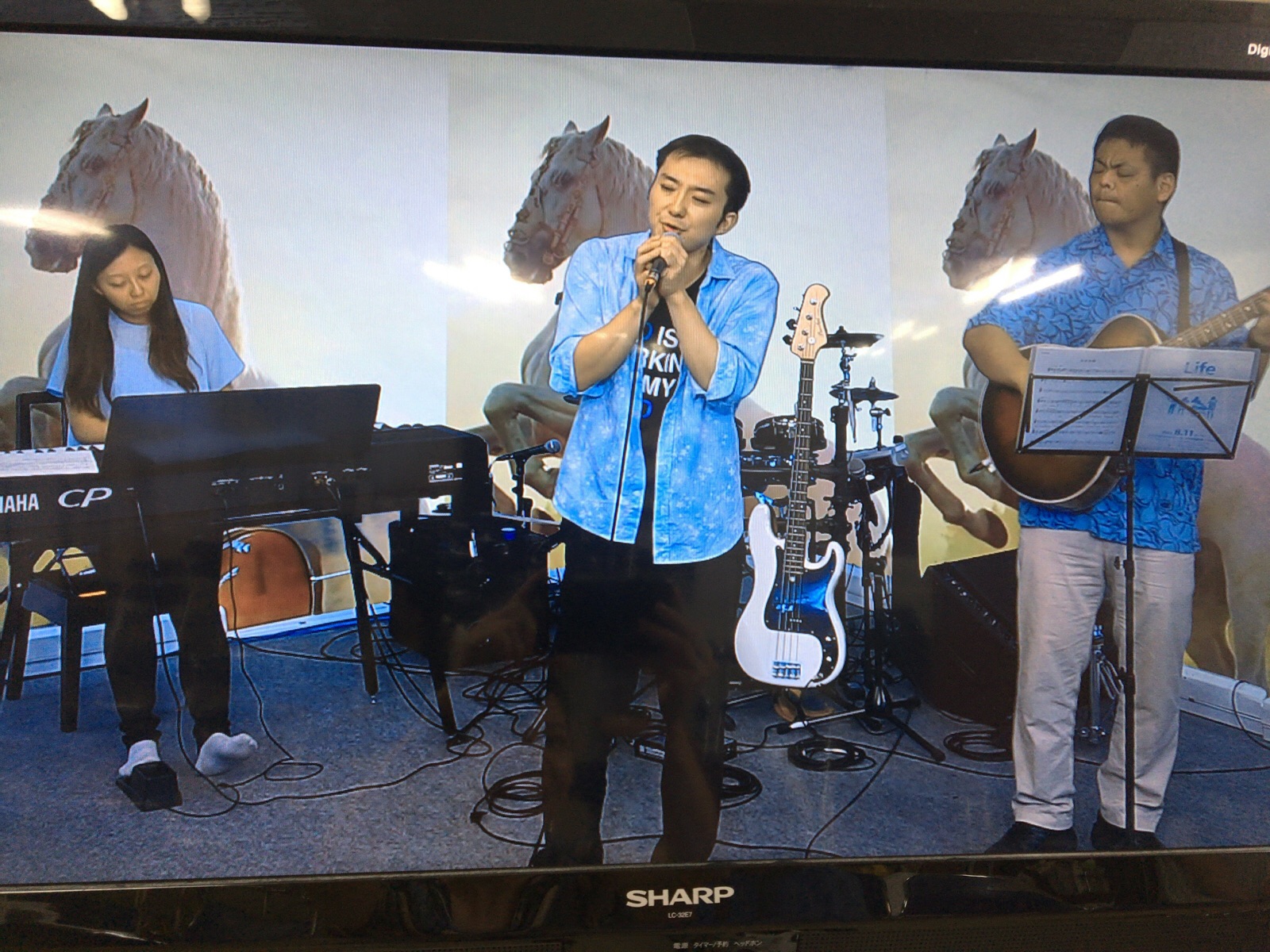 白馬を歌うシャローム。バックに白馬が1人1頭ずついます。 Yui