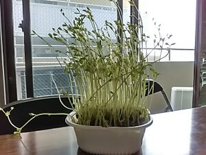 コンサートのための祈り会は、ミッションオフィスを借りて行っています。写真は、最近ブログに、よく登場する、ミッションの、豆苗。(正確には、おじろさんの)