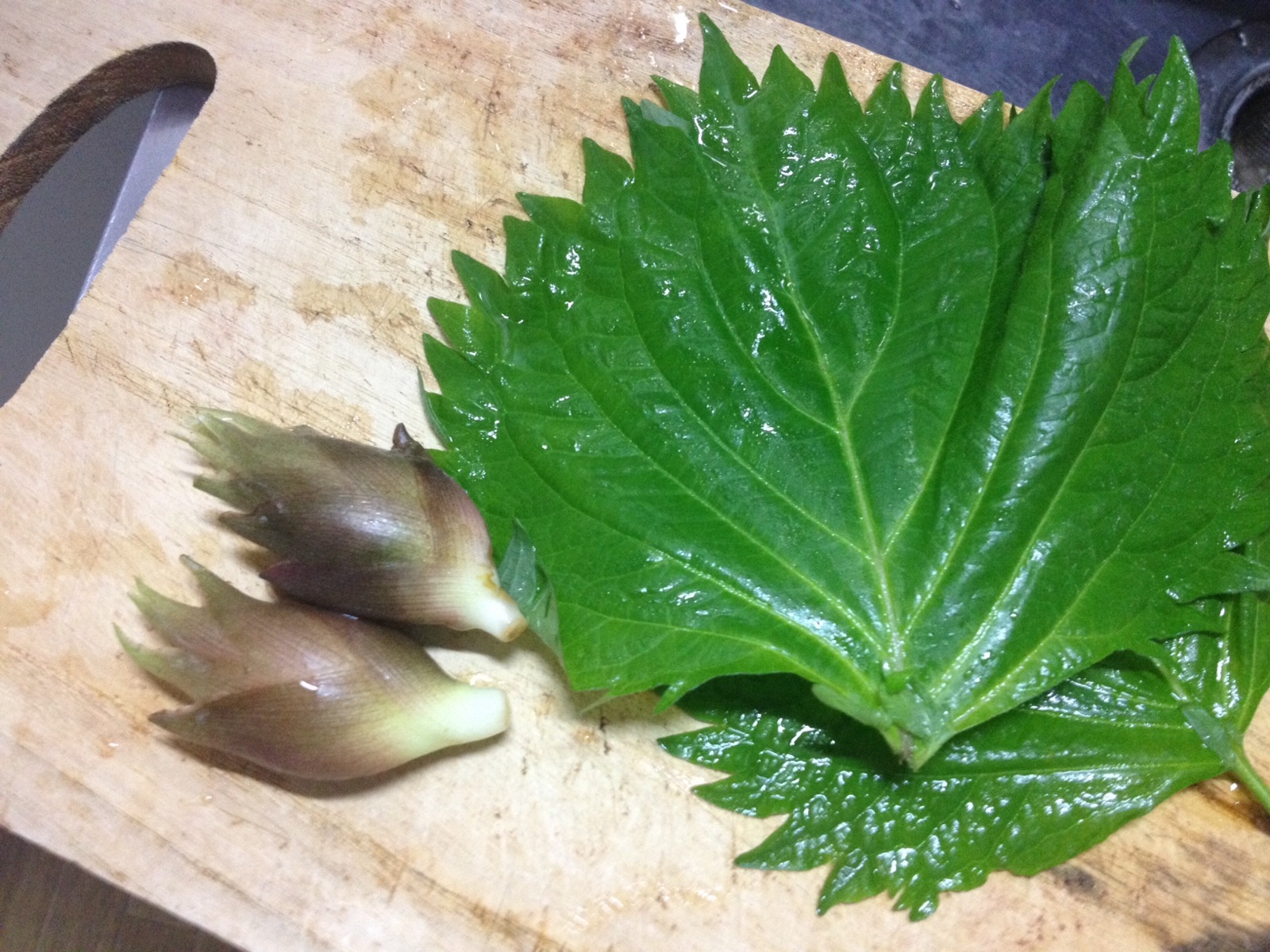 先日実家の庭で収穫したみょうがと大葉を刻みます。 kato