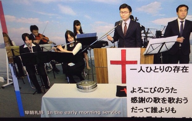 早朝礼拝が行われています。今日のメッセンジャーモーセ出西さん。娘さんはオーケストラメンバーで、かわいいバイオリニストとフルーティストです。
