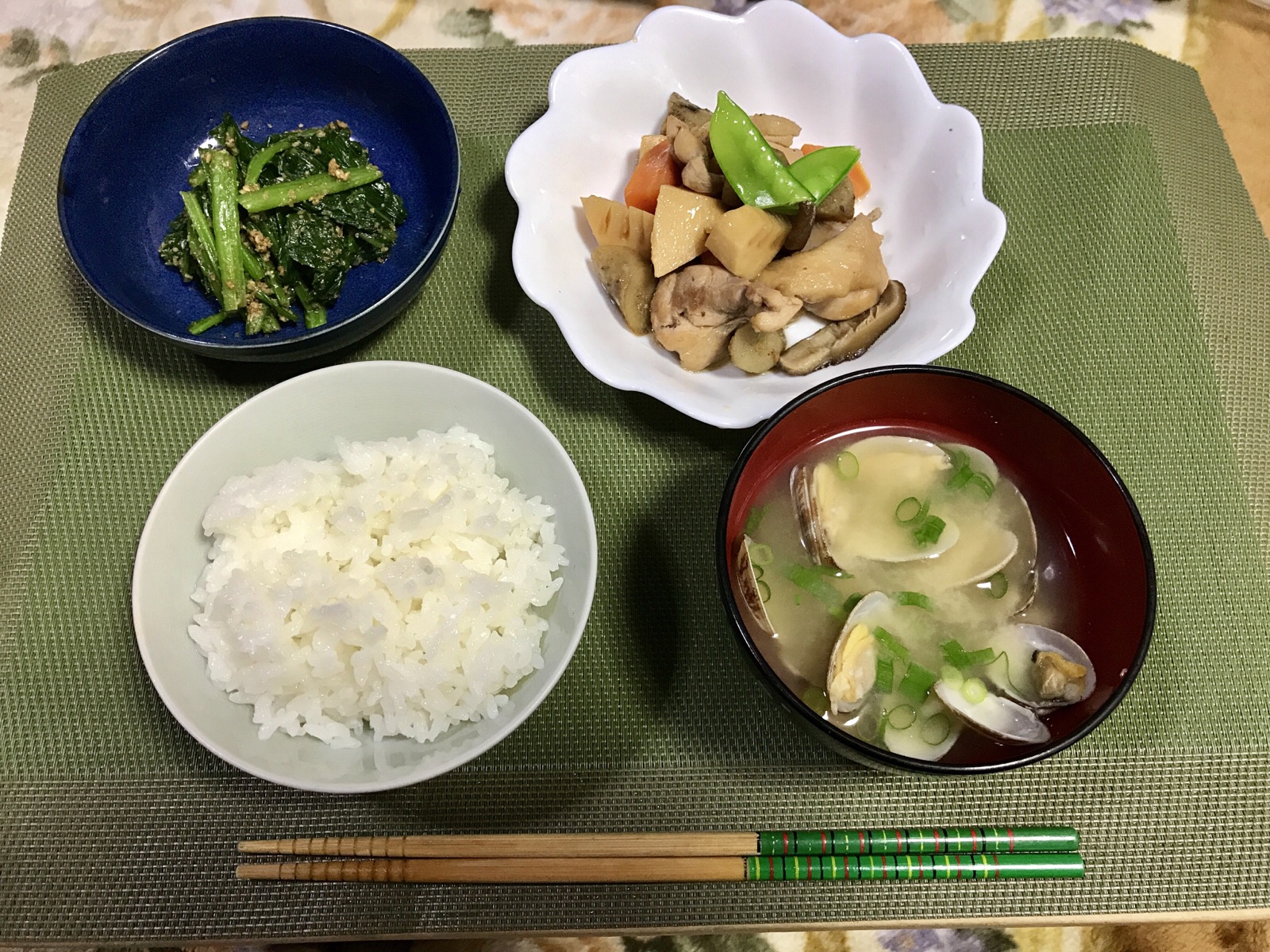 筑前煮、アサリ?のみそ汁、胡麻和え?などなど 美味しそう…でしたね〜 作ってくれる方募集したいです〜? amagai