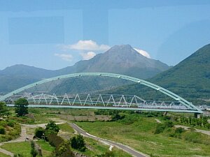 島原礼拝のためバスで移動しています。 雲仙普賢岳が見えます。