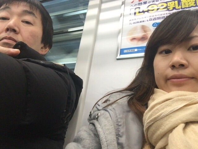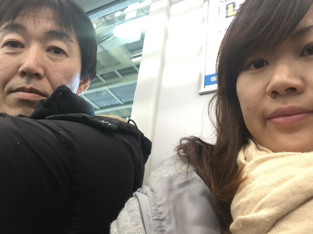 電車の中です!隣では、バッテリー思い出して良かったぁ〜。と安堵の声が響き渡ります。shoko