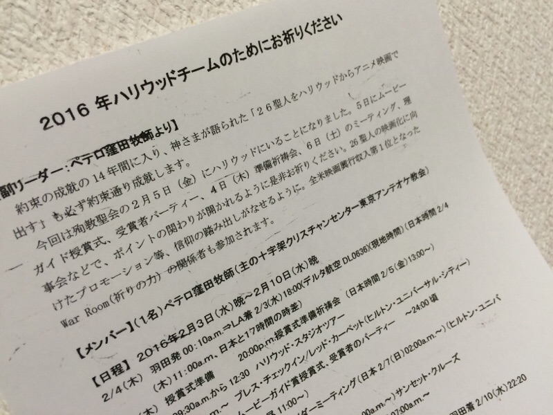 先ほど、ペテロ窪田総主事からハリウッドチームの祈りの課題がメールで届きWordにしました。明日印刷します。