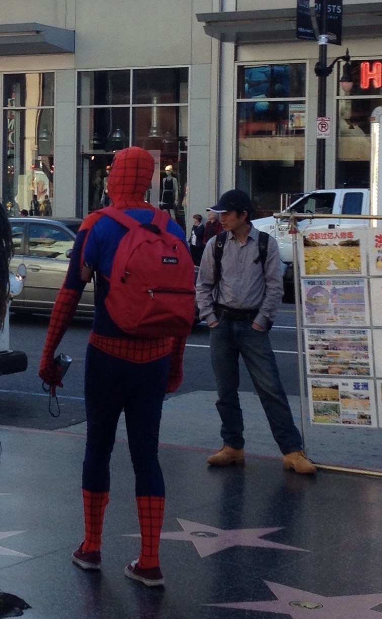 スパイダーマン?も歩いています! 一緒に写真を撮る事ができますが、1ドルくらい支払うようです。 後ろ姿は、多分無料? (^_^)v ロサンゼルス F