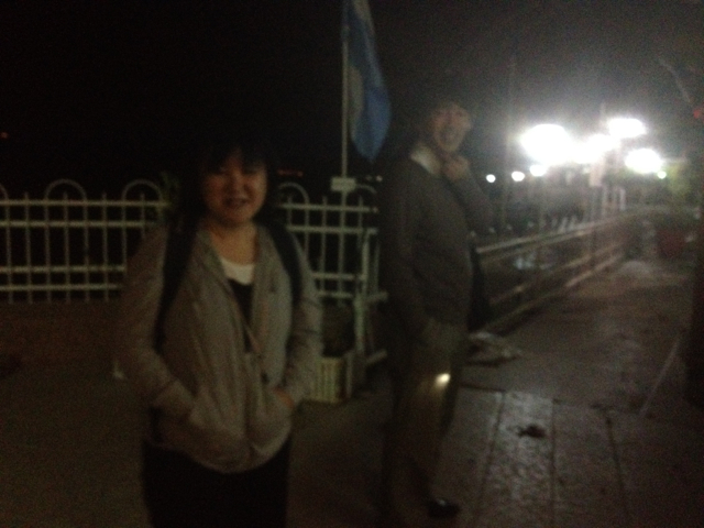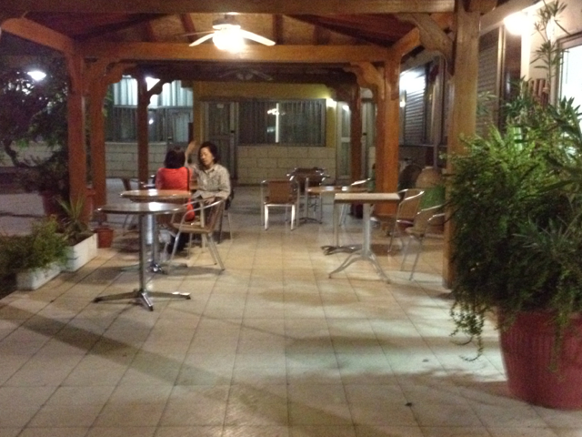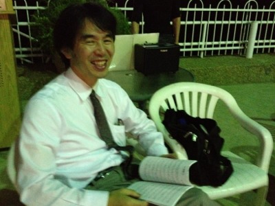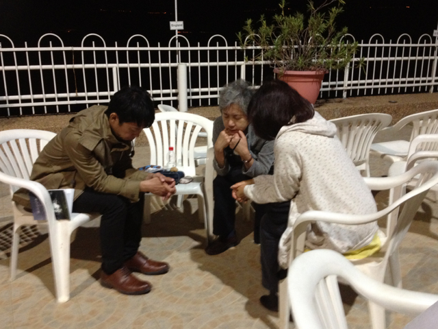 祈祷会始まる30前、来る人を待つテモテ牧師。風も波も穏やかです。寒くなくてよかったです。