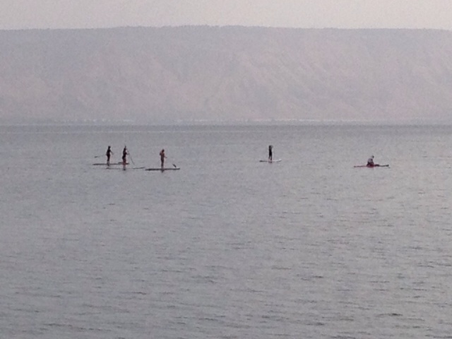 ガリラヤ湖の上を歩く人!? よく見るとサーフボードのような物に乗っていました。