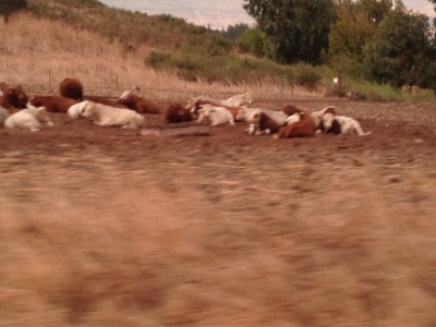 みな伏せて憩いの牛集団!