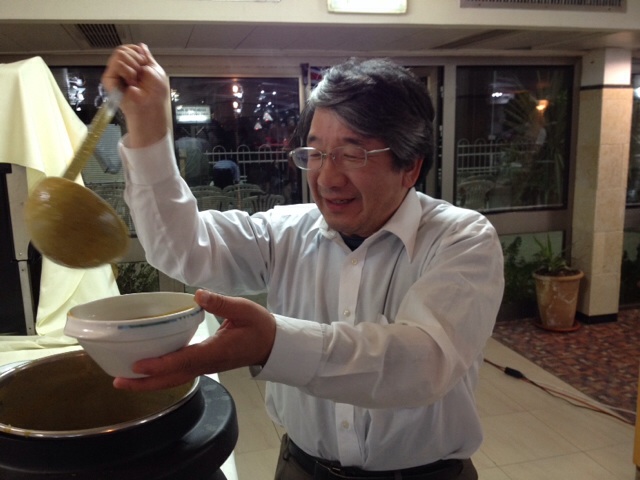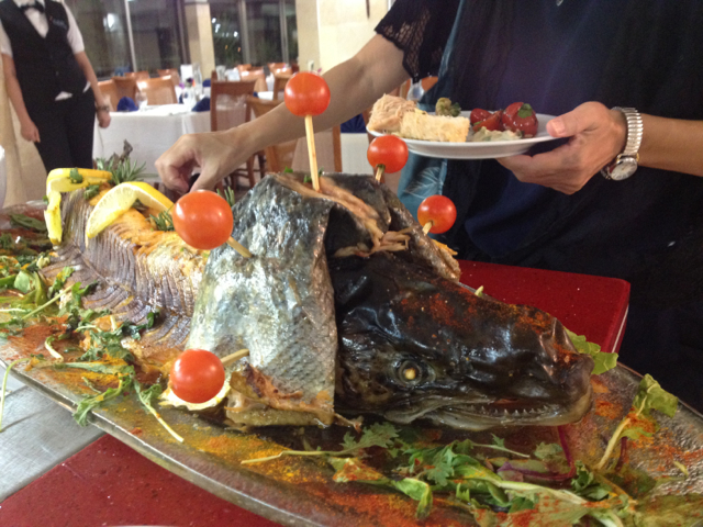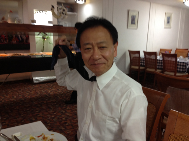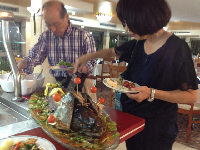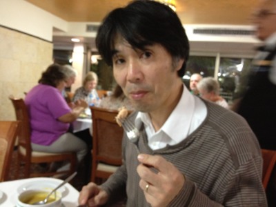 サーモンを食べてるテモテ牧師。カメラ失礼します。