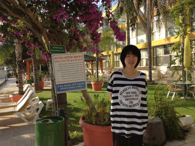 お庭で京子ちゃんとばったり。 立ち止まったその場所がブーゲンビリアの花の下で、パチリ。