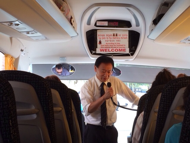 「こっちやでぇ〜」と関西風にバスへ誘導してくれる弓野牧師!