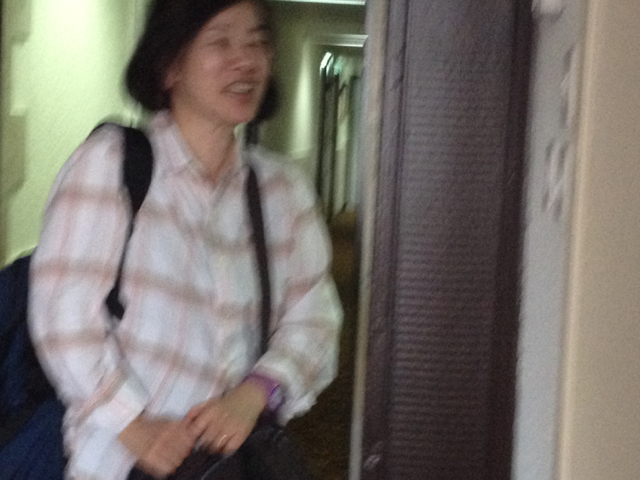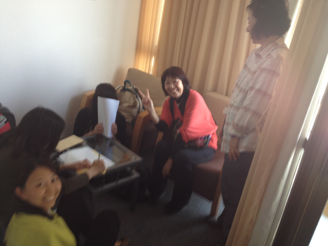 ミッションスタッフミーティング中! 喜びが戻った、さかき~♪ 歌う榊牧師。お約束の隠れるナオミ牧師。